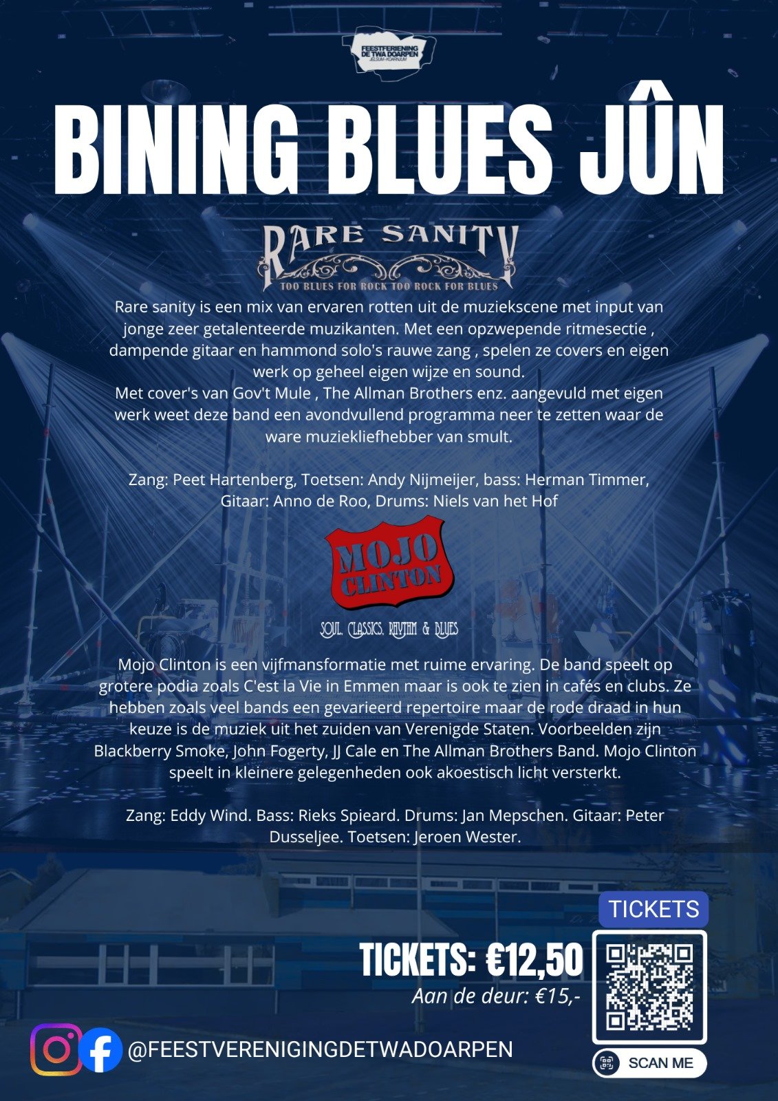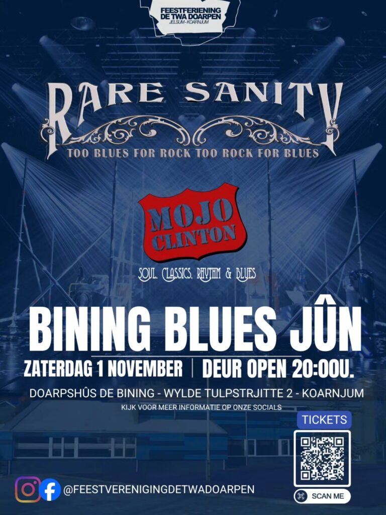 Op zaterdag 1 november organiseren Doarpshûs De Bining in samenwerking met de Feestvereniging de 5e editie van de Blues Jûn. Dit jaar komen onze vrienden van Rare Sanity en Mojo Clinton naar Koarnjum om jullie wederom een fantastische bluesavond te bezorgen.